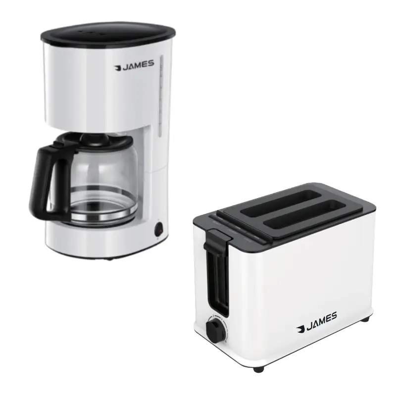 Comenzá tus mañanas con practicidad y estilo con este combo de desayuno James, que incluye cafetera de filtro y tostadora. Un conjunto ideal para preparar café y tostadas de forma rápida, con un diseño moderno en color blanco que combina fácilmente con cualquier cocina.